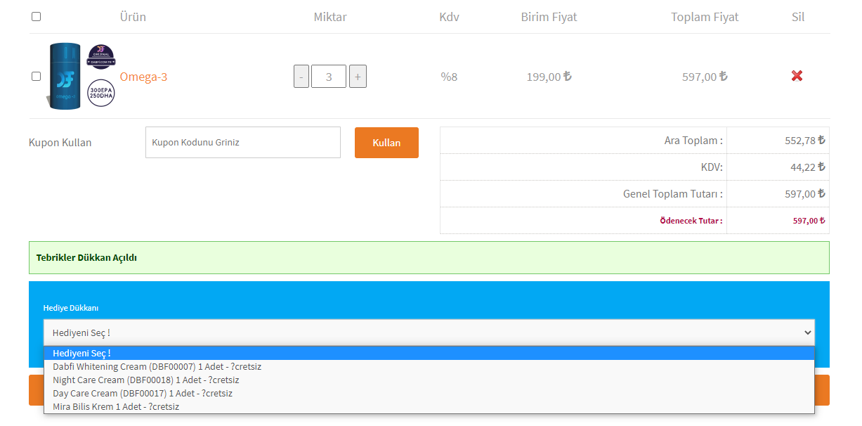 After creating your orders, you need to proceed after viewing your basket and selecting the gift product from the campaign window that opens.